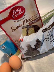 Combine cake mix, chocolate chips, oil or butter, and eggs in a mixing bowl.