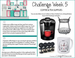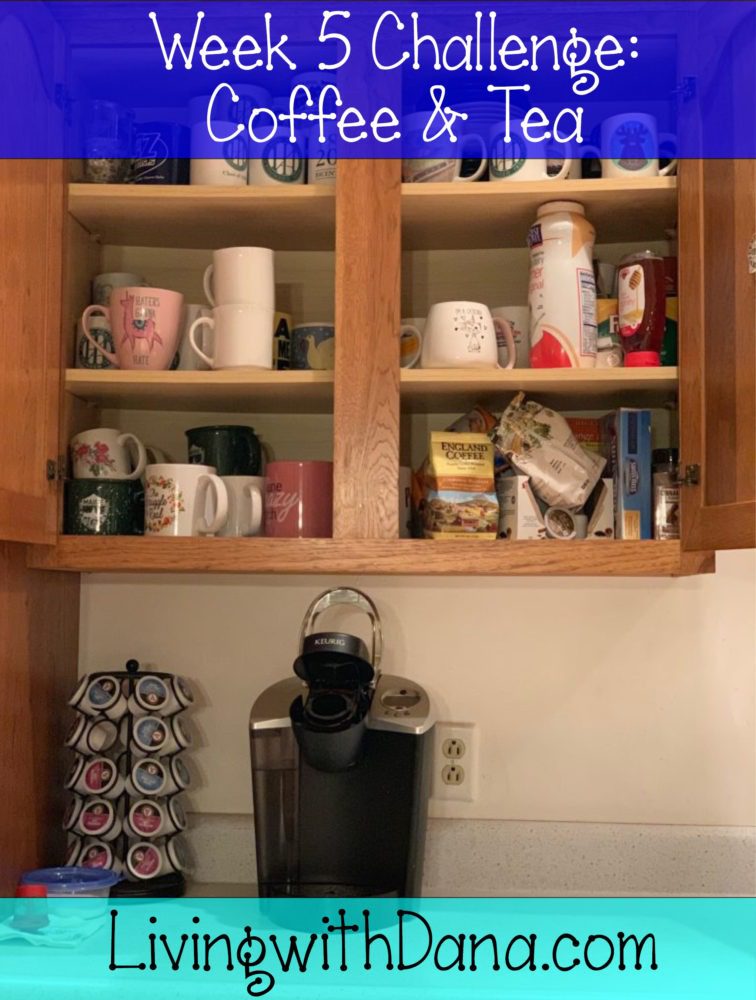 The challenge of Week 5 is to organize coffee mugs and tea cups. Include your travel coffee mugs, too.