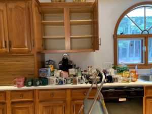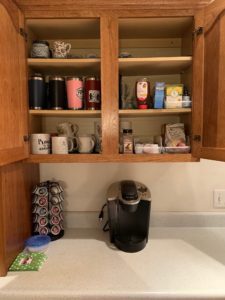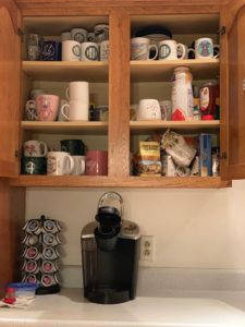 I followed the challenge’s steps by emptying the shelves of all coffee mugs, tea cups, travel mugs, etc., and put them all together to see what I was dealing with. I could see that there were more travel mugs and coffee mugs than could fit in the two cabinets above the coffee maker.