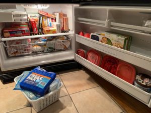 I did sort and group food items and put them in white plastic baskets purchased at the dollar store. The baskets wouldn’t fit in the pull-out wire freezer drawer. I removed the wire drawer and tried the baskets on the bottom of the freezer. Could not fit three baskets side by side and they were just a little too long. I could hear the food in the baskets get pushed each time I tested the freezer door to see if it would close properly. I tried a few configurations of the new white baskets in the freezer, but nothing seemed to work.