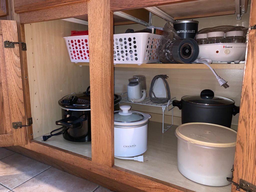 We grouped all appliances together on an unused shelf unit so we could see how many appliances we own. We gathered them from the counter, closet and various cabinets. Then we rated them by how often they were used.