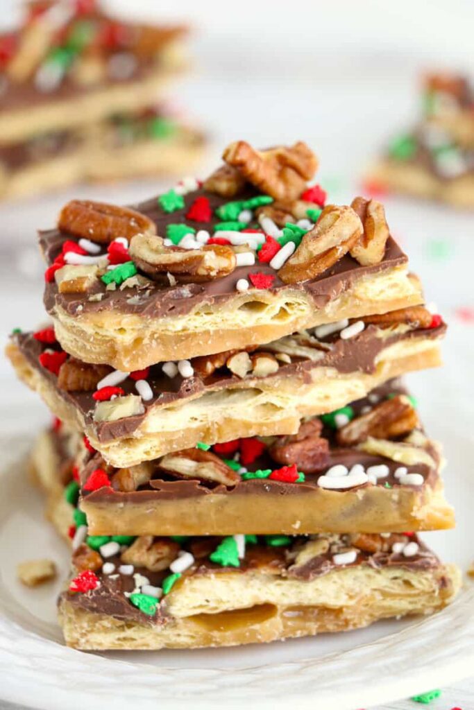 Preheat oven to 375°F. Line a baking sheet with aluminum foil and spray with cooking spray. Line with a single layer of crackers tightly arranged side-by-side. Break the crackers to fit the jelly roll pan. Set aside.
