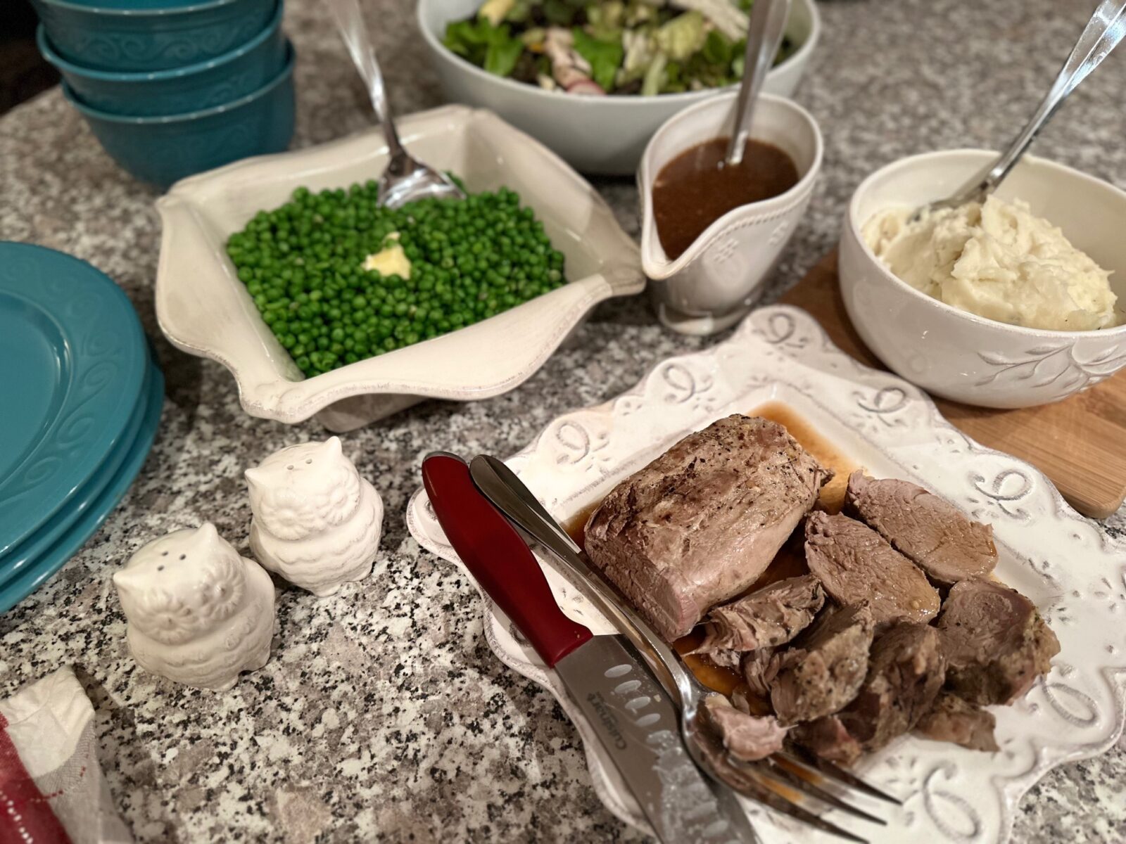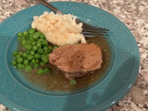 11. Time to eat! Serve the pork with gravy and mashed potatoes, peas, a side salad and bread of choice!