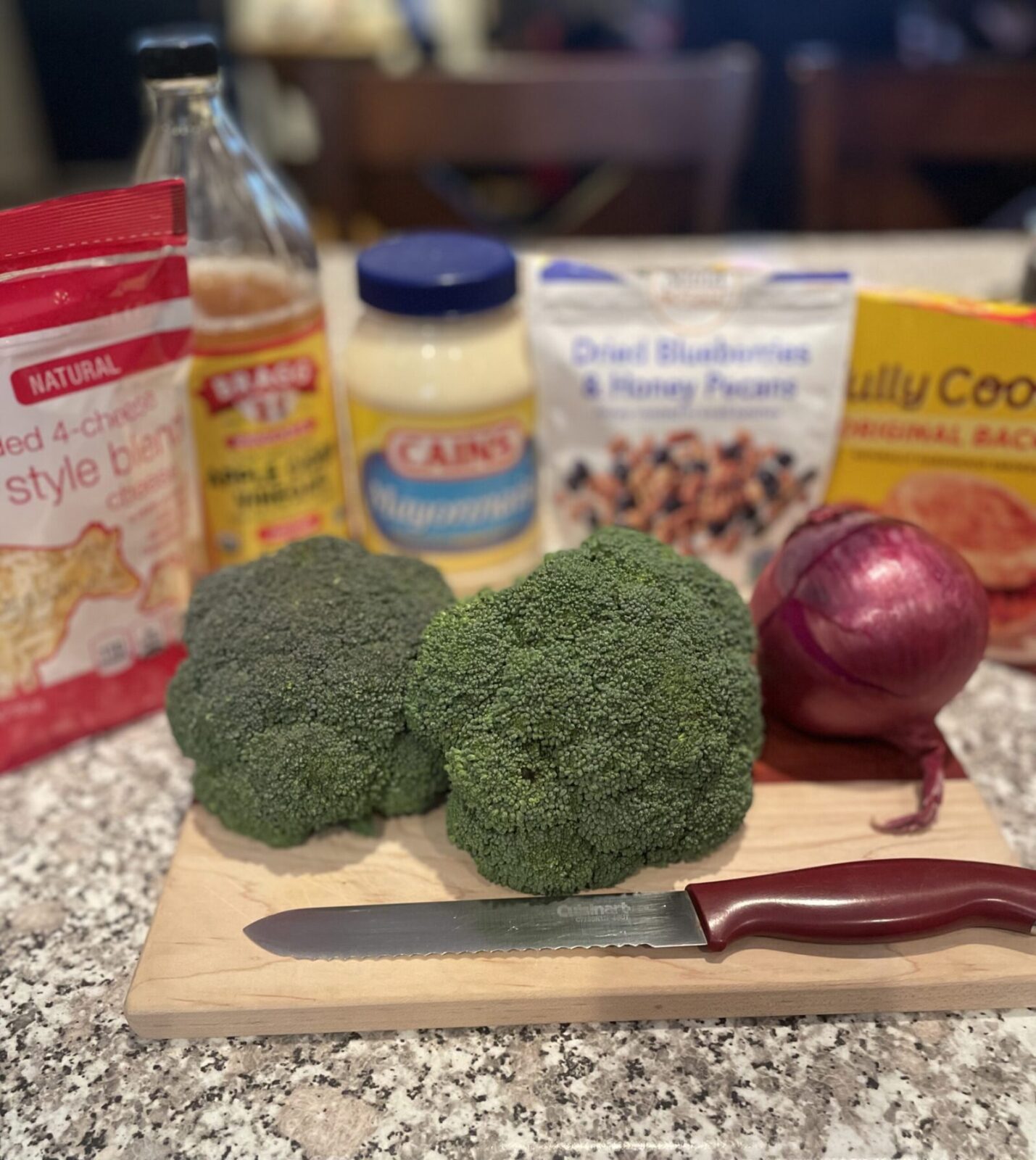 Broccoli Salad is a family favorite. My aunts will make it and bring it to family get-togethers. My family will have it as a side dish. For example, tonight we had Broccoli Salad with home cooked cheeseburgers. It was a delicious and easy-to-make combination.