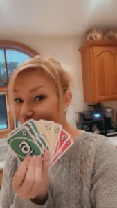 At least two in the family play UNO almost every night either before or after dinner. It’s fun and relaxing. With large groups playing UNO, the play can get cut-throat and boisterous, but still fun! We actually use two decks of cards and a battery-operated card shuffler.