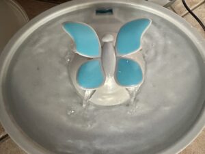I was anxious to set it up and see if our Ragdoll would take to drinking from it. It was easy to set up. I removed the untouched water bowl from the cat’s food spot and placed the fountain instead. Plugged it in, turned it on. Not too noisy. You have the option of keeping the butterfly in the flowing water to create fountains or remove the butterfly and let the water percolate in the fountain (less noisy).