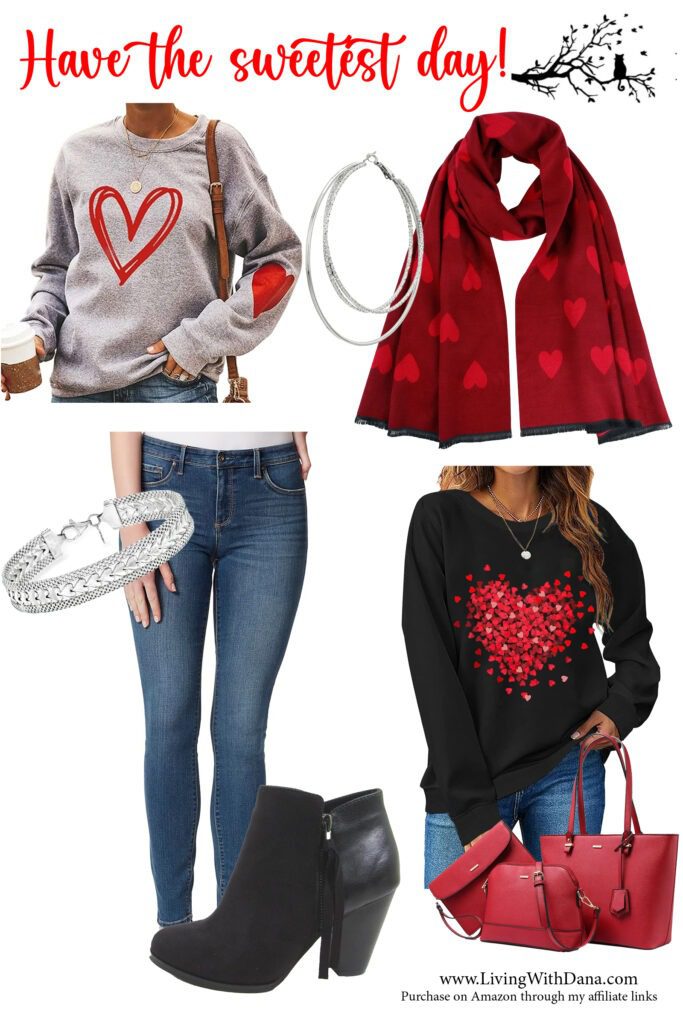 My sweet outfit gives you a choice of two loose fitting sweatshirts styled with hearts. If you click the Amazon affiliate link, you can see the other color choices. Have fun shopping!
