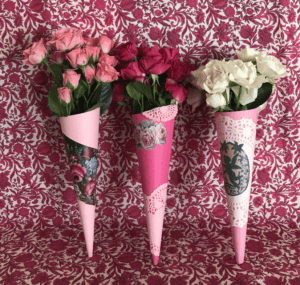Decorated cones are a pretty way to package up candy, cookies, or any little gift. They really are simple to make – just cut a square of paper and roll it up until it is open at the top and pointy at the end, then fix in place with glue or tape. (Tape is less messy, more secure, and you can cover any visible pieces with decorations.) Cones made from heavier paper or card make excellent flower holders, and are a really good way to eke out a couple of grocery store bouquets. They also look absolutely charming and will bring a delighted smile to anyone’s face.