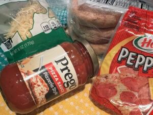 Have you ever had an English muffin pizza? I love them! They are very easy to make. Three ingredients plus toppers! One package of English muffins can feed six people if each person gets one muffin cut in half.