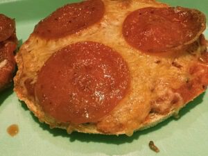 Pepperoni (about 3 pieces per half muffin), chopped ham, cooked crumbled Hamburg, anything goes!