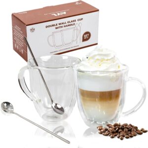 Double Wall Glass Coffee Mugs – 13 oz Insulated Clear Coffee Mugs Set of 2, Perfect for Espresso, Cappuccino, Latte, Tea – Elegant Glass