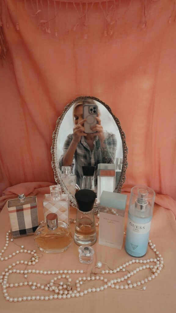 Here I am in the photo below with all my perfumes. I was getting ready to go out with my BFF and just needed a small spray of perfume. So many choices! Love them all!