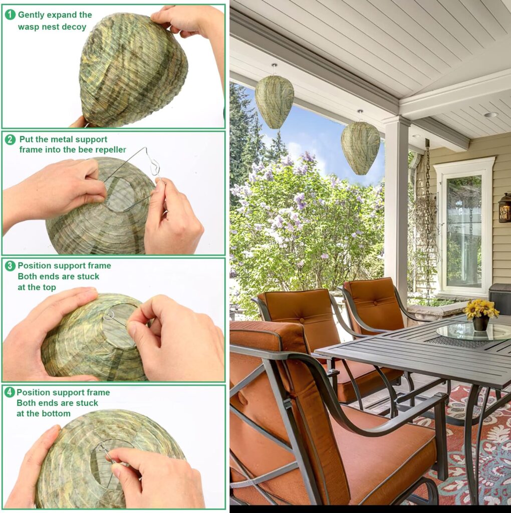 Wasps are territorial and instinctively, will not build nest near another colony. Once this fake wasp nest is placed, several species of wasps and hornets will pass right by and build their real nest in another location.