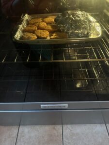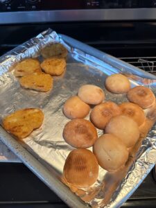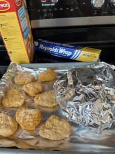 There are eight sliders in a box and this is how they come packaged. The directions called for the chicken patties to be taken out of the buns. Chicken patties are placed uncovered on a baking sheet. Buns are enclosed in foil and are placed on the same baking sheet as the chicken patties.