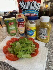 These are the dressings we tried: French’s Dill Pickle Mustard; Hellman’s Spicy Mayonnaise; Cains Mayonnaise; and Heinz Spicy Mustard. ย We had lettuce and tomatoes, and Munchos for a crunchy side.
