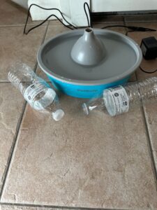 Of course the fountain needs to be need a wall outlet since it’s an electric pump that runs it. This fountain is across from the cat’s food. I’ve just washed and refilled with two bottles of purified water. Lucky cat!