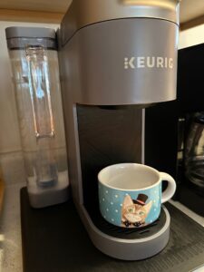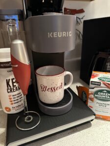 I usually buy my Keto Creamer at Big Lots, but I see now that Walmart carries it for the same price. Same with the Green Mountain coffee pods. I usually get them at the grocery store unless there’s a really big sale on them. I’ve bought pods as low as 25 cents each, which you don’t see too often. The coffee cup is a mystery. I think it may have been purchased at TJMaxx. Love that store! And I just have to use my brother to stir my coffee. This version comes with its own little stand.