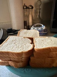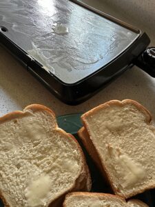 Turn the griddle on. I like it hot to start. Once it starts to warm up, drop a tablespoon or two of butter on the griddle and spread it as it melts. Before the butter starts to brown, start putting one slice of bread on the griddle at a time, butter side down on the griddle.
