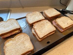 Grilled ham and cheese sandwiches are a staple in my family. They’re easy to make, and quick, too. I set up an assembly line of everything needed and can fit eight sandwiches on the griddle if needed.