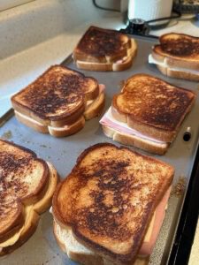 Put the cheese/ham/cheese on the bread that’s on the griddle and cover it with another slice of buttered bread, with the butter facing out.