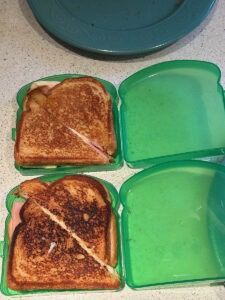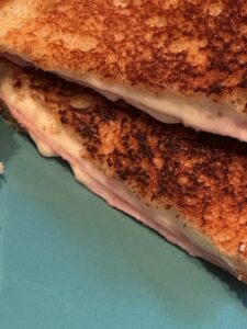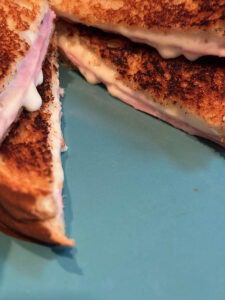 Turn the heat down on the griddle if it’s toasting the bread too fast because you want the cheese to get all melt-y and the ham to get warmed through.
