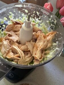 Add 2 cups cooked chicken meat. Chop in food processor. Add more chicken if you need to fill more than 16 rolls.