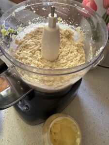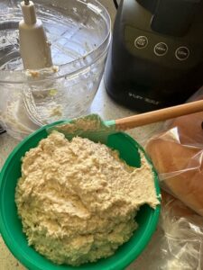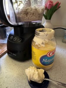 Add 2 tablespoons mayonnaise to start and blend in food processor. Add more as needed.