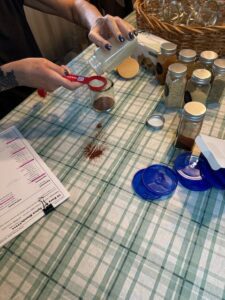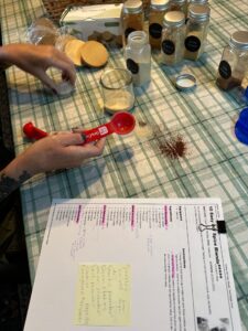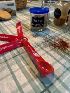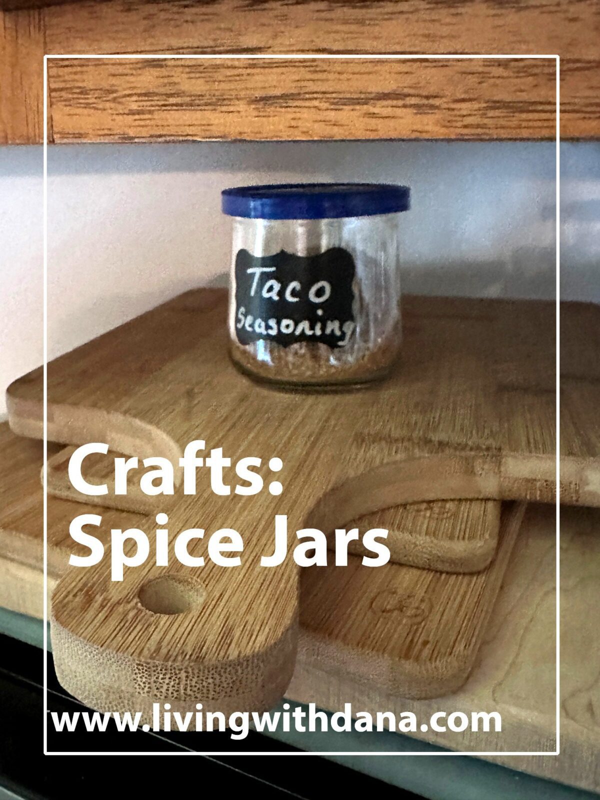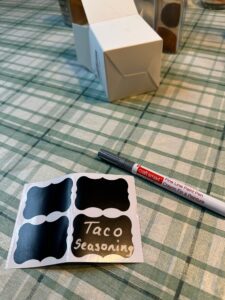 If you like re-purposing items when they’ve finished their intended goal, then you’ll like this craft project. I used glass yogurt jars, bought two different types of lids made specifically for these jars, and spices to make themed seasonings. For this example, I put together spices to make up my taco seasoning jar.