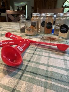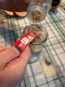 I have 18 of these jars all washed and ready to become re-purposed! Seasoning jars aren’t the only craft I have planned for these jars so stay tuned! The labels weren’t difficult to peel off. If I got them out of the dish warmer while still warm, they peeled right off. If not, I soaked in hot water and then the labels peeled off easily. The most difficult part was getting the label glue residue off the glass. Steel wool scrubbing pad works best. Took my nail polish off though! LOL. Also, the tin foil glue from the cover of the yogurt jar leaves a hard-to-remove glue residue that really needs to be scrubbed to remove. I did try things like nail polish remover and glass-top oven cleaner, but the scrub pad worked best.