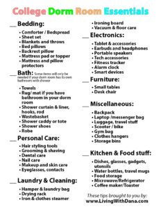 Here is the dorm room checklist I made. Click on it or click here for a downloadable PDF to print.