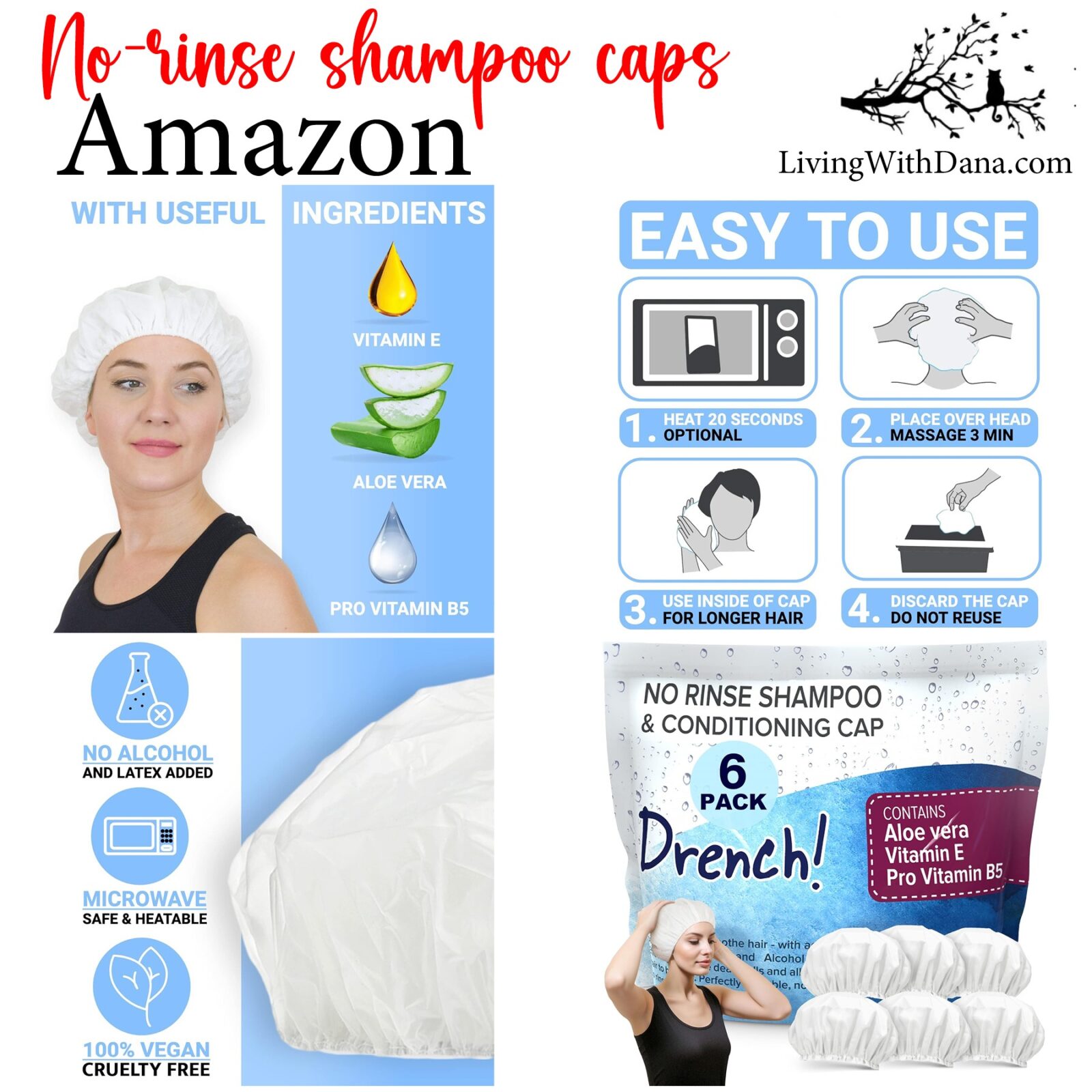 Drench! No Rinse Shampoo Caps – Waterless Shampoo and Conditioner Hair Wash Cap – Dry Hair Washing Aids with Aloe Vera and Vitamins – Pack of 6. Amazon affiliate link https://amzn.to/4c5KhYm