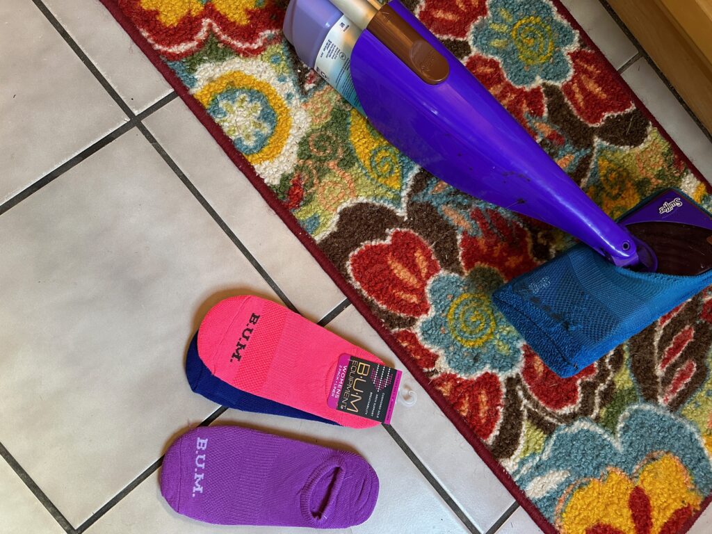 Most adults who have the task of washing floors have heard of the Swiffer brand and probably used it or a knock-off. My brother had a Swiffer and then decided he wanted to let me have it, so I brought it to camp. As you can imagine, the floors at camp can get sandy and people often bring in pine needles on their shoes. I started buying fluffy, fuzzy footy socks at the dollar store (sometimes two pairs for $1.00!) and stretching them over the mop head.