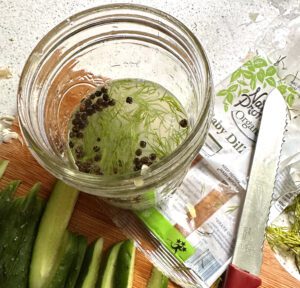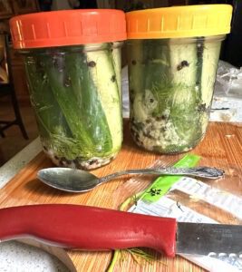Last year I did not see pickling cukes readily available. I think it was an off year for growing cucumbers. This year, you know what happened? I went in the farmer’s market and didn’t see pickling cukes, but did see some small regular cukes, so I bought those.