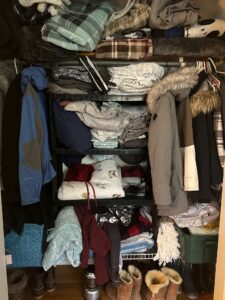 The closet that I use to store my linens is actually a coat closet where I inserted a shelf unit to hold the linen. What a hot mess!
