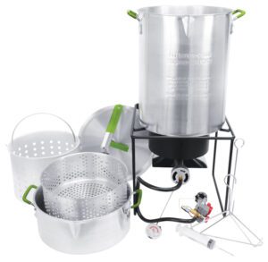 Here’s another version of the deep fryer: Pairing a capable propane burner stand with a turkey fryer set and fish fryer set, this capable combo gives you lots of frying and boiling ability for outdoor cookouts.