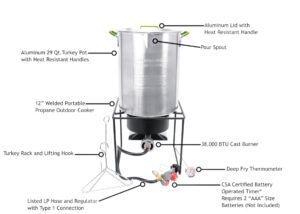 Get impressive frying capability at a great price with the Bass Pro Shops® Outdoor Turkey Fryer. Starting with a 38,000 BTU cast burner in a sturdy and stable 12″ welded stand, this fryer set offers big cooking ability enclosed in a strong stand. Burner comes with an LP hose and regulator with Type 1 connection that features a CSA-certified, battery-operated timer (uses 2 AAA batteries not included) for added safety on big cooking jobs. The combo’s turkey set combines a 29-qt. aluminum turkey pot with pour spout, heat-resistant handles, and lid, giving you the ability to fry up to a 20-lb. turkey. This turkey-cooking set comes with a turkey rack and lifting hook and deep-fry thermometer. Runs on 20 lb. propane tank (not included).