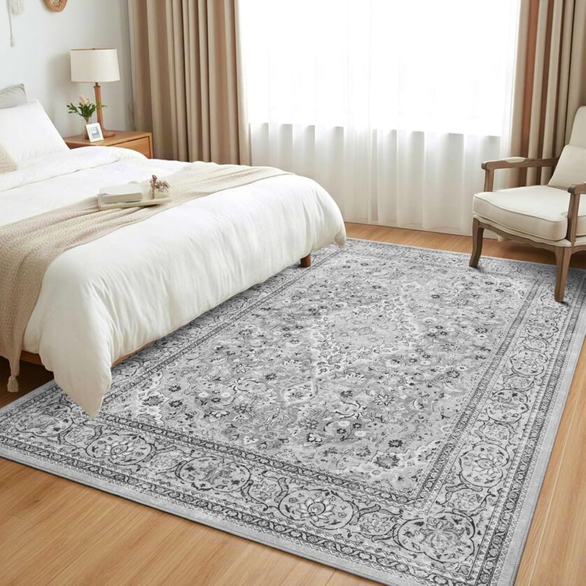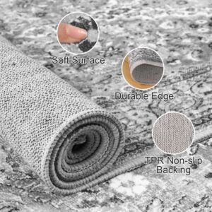 [a d] 5×7 Washable Boho Area Rug, Grey Vintage Non-Slip Rug, Low Pile Floral Indoor Rugs, Soft Wool Rug Distressed Print Pattern Carpet.