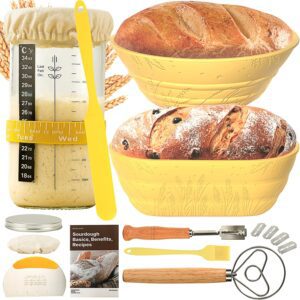 Complete Sourdough Bread Kit – Everything you need for bread baking is included. Get the baking set with a 34 oz Starter Jar Kit, 9” Round Silicone Bread Proofing Basket, 10” Oval Silicone Bread Proofing Basket, Silicone Spatula, Tracking Band, Thermometer Strip, Breathable Cloth Cover, Airtight Aluminum Lid, Dough Slicer, Sourdough Whisk, Sourdough Recipe Book, Bread Lame + 5 Blades, and Oil Brush.