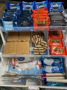 As you can see, the tackle box (snacklebox!) holds a lot of stuff that you can use when making your favorite s’mores. Not shown in the picture is a jar of peanut butter, but the Reese’s peanut butter cups do a good job, too!