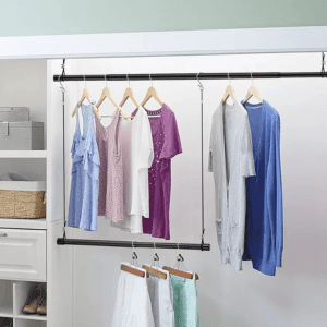 Use a second tension rod or add hanging shelves to make space for shoes, jeans, and bags.