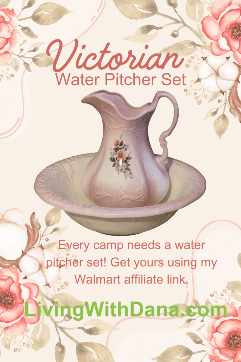 I purchased this reproduction Victorian water pitcher and bowl set and it is on a cute night stand at camp. Every camp needs one, especially if your camp has a water pump! I’ve used the pitcher as a vase in the past with eucalyptus leaves; another time it was dried flowers with baby’s breath; and another time it was silk flowers. ย
