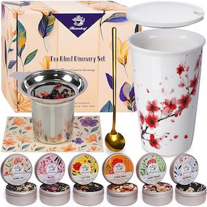 Chamomile is my favorite tea for relaxing. Tea Gift Set for Women – 6 Herbal Loose Leaf Tea Blends, Insulated Ceramic Cup with Infuser & Lid. Amazon affiliate link https://amzn.to/43z1hVl