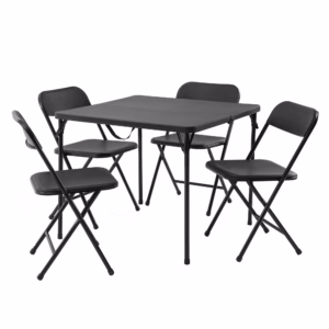 Mainstays 5-Piece Resin Card Folding Table + 4 Folding Chairs Set (Black) — great option when you need comfortable seating for guests and want to keep things compact when they depart. Affiliate link: https://walmrt.us/4hOjuUZ