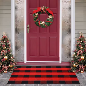 Outdoor/Indoor Door Mat (27.5″×43″ red & black plaid) — perfect for layering with a cute welcome mat and setting a “holiday zone” as soon as guests step inside. Affiliate link: https://walmrt.us/4qXBkZR